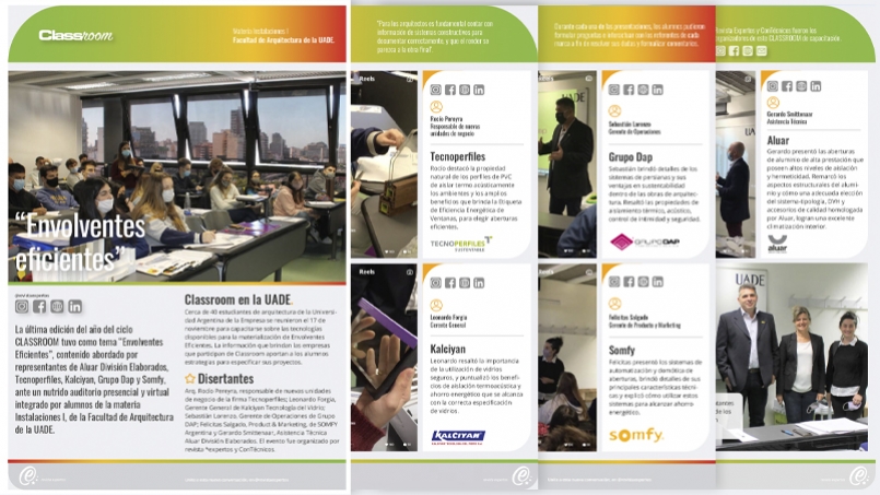 Además, la última edición del año del ciclo CLASSROOM, tuvo como tema “Envolventes Eficientes”, contenido abordado por representantes de Aluar División Elaborados, Tecnoperfiles, Kalciyan, Grupo Dap y Somfy, ante un nutrido auditorio presencial y virtual integrado por alumnos de la materia Instalaciones I, de la Facultad de Arquitectura de la UADE.